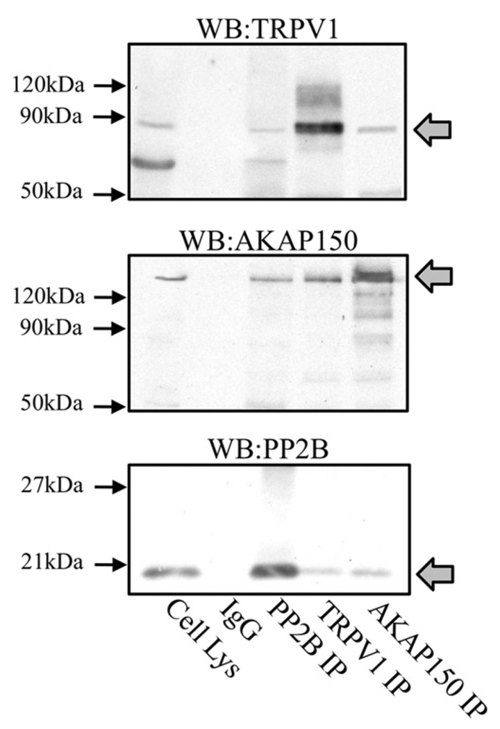 Activation of protein kinases and phosphatases at the plasma membrane often initiates agonist-dependent signalling events. In sensory neurons, AKAP150 (A-kinase-anchoring protein 150) orientates PKA (protein kinase A), PKC (protein kinase C) and the Ca2+/calmodulin-dependent PP2B (protein phosphatase 2B, also known as calcineurin) towards membrane-associated substrates. Recent evidence indicates that AKAP150-anchored PKA and PKC phosphorylate and sensitize the TRPV1 (transient receptor potential subfamily V type 1 channel, also known as the capsaicin receptor). In the present study, we explore the hypothesis that an AKAP150-associated pool of PP2B catalyses the dephosphorylation and desensitization of TRPV1. Biochemical, electrophysiological and cell-based experiments indicate that PP2B associates with AKAP150 and TRPV1 in cultured TG (trigeminal ganglia) neurons. Gene silencing of AKAP150 reduces basal phosphorylation of TRPV1. However, functional studies in neurons isolated from AKAP150-/- mice indicate that the anchoring protein is not required for pharmacological desensitization of TRPV1. Behavioural analysis of AKAP150-/- mice further support this notion, demonstrating that agonist-stimulated desensitization of TRPV1 is sensitive to PP2B inhibition and does not rely on AKAP150. These findings allow us to conclude that pharmacological desensitization of TRPV1 by PP2B may involve additional regulatory components.
