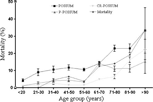 Results: POSSUM, P-POSSUM, and CR-POSSUM have a significant predictive value for outcome after colorectal surgery. Within the total population as well as in all four subgroups, there is no difference in the area under the curve between the POSSUM, P-POSSUM, and CR-POSSUM scores. In the subgroup analysis, smallest areas under the ROC curve are seen in operations performed for malignancy, which is significantly worse than for diverticulitis and in operations performed for other indications. For elective procedures, P-POSSUM and CR-POSSUM predict outcome significantly worse in patients operated for carcinoma than in patients with diverticulitis. In acute surgical interventions, CR-POSSUM predicts mortality better in diverticulitis than in patients operated for other indications. The ACPGBI score has a larger area under the curve than any of the POSSUM scores. Morbidity as predicted by POSSUM is most accurate in procedures for diverticulitis and worst when the indication is malignancy.