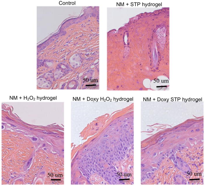Doxycycline hydrogels containing reversible disulfide crosslinks were investigated for a dermal wound healing application. Nitrogen mustard (NM) was used as a surrogate to mimic the vesicant effects of the chemical warfare agent sulfur mustard. An 8-arm-poly(ethylene glycol) (PEG) polymer containing multiple thiol (-SH) groups was crosslinked using hydrogen peroxide (H(2)O(2) hydrogel) or 8-arm-S-thiopyridyl (S-TP hydrogel) to form a hydrogel in situ. Formulation additives (glycerin, PVP and PEG 600) were found to promote dermal hydrogel retention for up to 24 h. Hydrogels demonstrated high mechanical strength and a low degree of swelling (< 1.5%). Doxycycline release from the hydrogels was biphasic and sustained for up to 10-days in vitro. Doxycycline (8.5 mg/cm(3)) permeability through NM-exposed skin was elevated as compared to non vesicant-treated controls at 24, 72 and 168 h post-exposure with peak permeability at 72 h. The decrease in doxycycline permeability at 168 h correlates to epidermal re-epithelialization and wound healing. Histology studies of skin showed that doxycycline loaded (0.25% w/v) hydrogels provided improved wound healing response on NM-exposed skin as compared to untreated skin and skin treated with placebo hydrogels in an SKH-1 mouse model. In conclusion, PEG-based doxycycline hydrogels are promising for dermal wound healing application of mustard injuries.