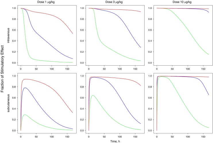 The objective of this study was to characterize the pharmacokinetics and pharmacodynamics (PK-PD) of romiplostim after single-dose administration in healthy subjects. The mean serum romiplostim concentrations (PK data) and mean platelet counts (PD data) collected from 32 subjects receiving a single intravenous (0.3, 1 and 10 μg/kg) or subcutaneous (0.1, 0.3, 1, and 2 μg/kg) dose were fitted simultaneously to a mechanistic PK-PD model based on pharmacodynamics-mediated drug disposition (PDMDD) and a precursor pool lifespan concept. The two-compartment PK model incorporated receptor-mediated endocytosis and linear mechanisms as parallel elimination pathways. The maximal concentration of receptors (assumed to be proportional to the platelet count), the equilibrium dissociation constant, and the first-order internalization rate constant for endocytosis of the drug-receptor complex were 0.022 fg/platelet, 0.131 ng/mL, and 0.173 h⁻¹, respectively. Romiplostim concentration stimulates the production of platelet precursors via the Hill function, where the SC₅₀ was 0.052 ng/mL and S (max) was 11.2. The estimated precursor cell and platelet lifespans were 5.9 and 10.5 days, respectively. Model-based simulations revealed that the romiplostim exposure and the platelet response are both dependent on the dose administered and the baseline platelet counts. Also, weekly dosing produced a sustained PD response while dosing intervals ≥2 weeks resulted in fluctuating platelet counts. Thus, the mechanistic PK-PD model was suitable for describing the romiplostim PK-PD interplay (PDMDD), the dose-dependent platelet stimulation, and the lifespans of thrombopoietic cell populations.