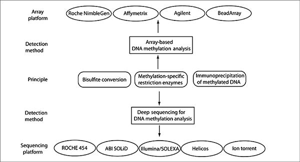 The covalent DNA modification of cytosine at position 5 (5-methylcytosine; 5mC) has emerged as an important epigenetic mark most commonly present in the context of CpG dinucleotides in mammalian cells. In pluripotent stem cells and plants, it is also found in non-CpG and CpNpG contexts, respectively. 5mC has important implications in a diverse set of biological processes, including transcriptional regulation. Aberrant DNA methylation has been shown to be associated with a wide variety of human ailments and thus is the focus of active investigation. Methods used for detecting DNA methylation have revolutionized our understanding of this epigenetic mark and provided new insights into its role in diverse biological functions. Here we describe recent technological advances in genome-wide DNA methylation analysis and discuss their relative utility and drawbacks, providing specific examples from studies that have used these technologies for genome-wide DNA methylation analysis to address important biological questions. Finally, we discuss a newly identified covalent DNA modification, 5-hydroxymethylcytosine (5hmC), and speculate on its possible biological function, as well as describe a new methodology that can distinguish 5hmC from 5mC.