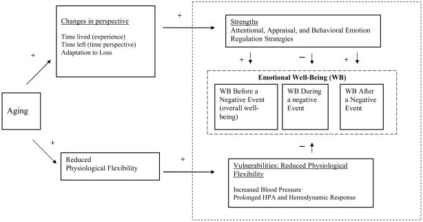 The following article presents the theoretical model of strength and vulnerability integration (SAVI) to explain factors that influence emotion regulation and emotional well-being across adulthood. The model posits that trajectories of adult development are marked by age-related enhancement in the use of strategies that serve to avoid or limit exposure to negative stimuli but by age-related vulnerabilities in situations that elicit high levels of sustained emotional arousal. When older adults avoid or reduce exposure to emotional distress, they often respond better than younger adults; when they experience high levels of sustained emotional arousal, however, age-related advantages in emotional well-being are attenuated, and older adults are hypothesized to have greater difficulties returning to homeostasis. SAVI provides a testable model to understand the literature on emotion and aging and to predict trajectories of emotional experience across the adult life span.