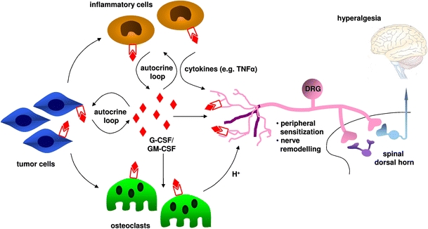 A variety of cancers are accompanied by debilitating pain, which constitutes the primary reason for poor quality of life in cancer patients. There is an urgent demand for the development of specific mechanism-based therapies against cancer pain. Recently, important advances have been made in mechanisms contributing to cancer pain. A notable finding was that the tumor-derived hematopoietic growth factors, granulocyte- and granulocyte-macrophage-colony-stimulating factors (G-CSF/GM-CSF), subserve important functions in the generation of pain hypersensitivity in tumor-affected regions. In this context, their receptors were unexpectedly found on pain-sensing nerves and were observed to be functionally linked to nociceptive sensitization and tumor-induced pain. Here, we review evidence supporting a role for G-/GM-CSF in sensitization of pain-sensing nerves, the underlying signaling pathways and the cross-talk with other pronociceptive cytokines, peptides and modulators derived from immune cells, osteoclasts and tumor cells. These findings hold implications in the therapy of pain in disease states, such as cancer and rheumatoid arthritis.