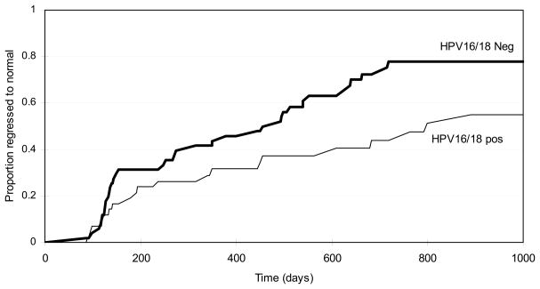 Results: Ninety-five patients with a mean age of 20.4 years (±2.3) were entered into the analysis. Thirty-eight percent resolved by year 1, 63% resolved by year 2, and 68% resolved by year 3. Multivariable analysis found that recent Neisseria gonorrhoeae infection (hazard ratio 25.27; 95% confidence interval [CI] 3.11-205.42) and medroxyprogesterone acetate use (per month) (hazard ratio 1.02; 95% CI 1.003-1.04) were associated with regression. Factors associated with nonregression included combined hormonal contraception use (per month) (hazard ratio 0.85; 95% CI 0.75-0.97) and persistence of human papillomavirus (HPV) of any type (hazard ratio 0.40; 95% CI 0.22-0.72). Fifteen percent of patients showed progression by year 3. HPV 16/18 persistence (hazard ratio 25.27; 95% CI 2.65-241.2; P=.005) and HPV 16/18 status at last visit (hazard ratio 7.25; 95% CI 1.07-49.36; P<.05) were associated with progression Because of the small sample size, other covariates were not examined.