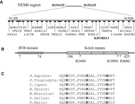 We identified a member of the BTB/Kelch protein family that is mutated in nemaline myopathy type 6 (NEM6), an autosomal-dominant neuromuscular disorder characterized by the presence of nemaline rods and core lesions in the skeletal myofibers. Analysis of affected families allowed narrowing of the candidate region on chromosome 15q22.31, and mutation screening led to the identification of a previously uncharacterized gene, KBTBD13, coding for a hypothetical protein and containing missense mutations that perfectly cosegregate with nemaline myopathy in the studied families. KBTBD13 contains a BTB/POZ domain and five Kelch repeats and is expressed primarily in skeletal and cardiac muscle. The identified disease-associated mutations, C.742C>A (p.Arg248Ser), c.1170G>C (p.Lys390Asn), and c.1222C>T (p.Arg408Cys), located in conserved domains of Kelch repeats, are predicted to disrupt the molecule's beta-propeller blades. Previously identified BTB/POZ/Kelch-domain-containing proteins have been implicated in a broad variety of biological processes, including cytoskeleton modulation, regulation of gene transcription, ubiquitination, and myofibril assembly. The functional role of KBTBD13 in skeletal muscle and the pathogenesis of NEM6 are subjects for further studies.