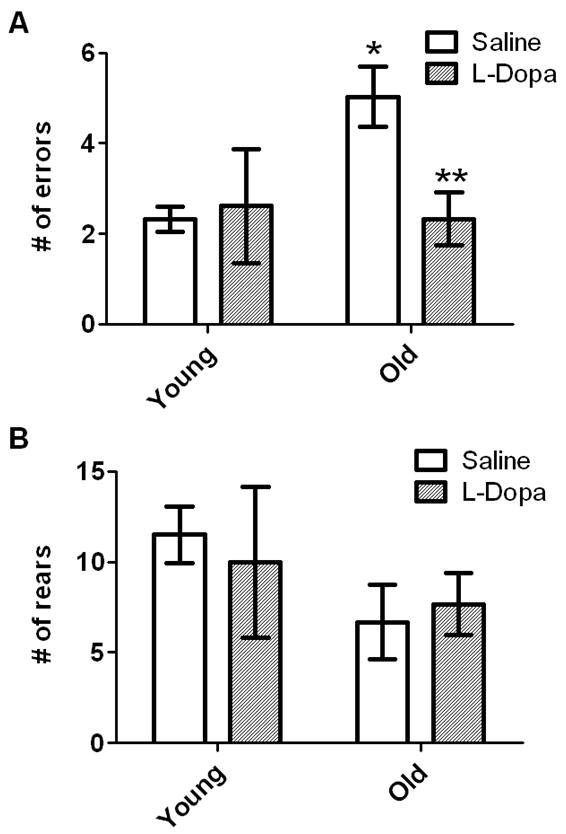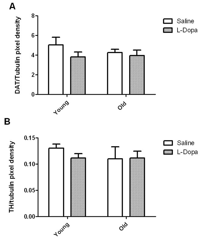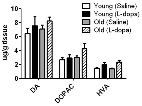 We wished to determine whether L-DOPA, a common treatment for the motor deficits in Parkinson's disease, could also reverse the motor deficits that occur during aging. We assessed motor performance in young (2-3 months) and old (20-21 months) male C57BL/6 mice using the challenge beam and cylinder tests. Prior to testing, mice were treated with L-DOPA or vehicle. Following testing, striatal tissue was analyzed for phenotypic markers of dopamine neurons: dopamine, dopamine transporter, and tyrosine hydroxylase. Although the dopaminergic markers were unchanged with age or L-DOPA treatment, L-DOPA reversed the motor deficits in the old animals such that their motor coordination was that of a young mice. These findings suggest that some of the locomotor deficits that accompany normal aging are responsive to L-DOPA treatment and may be due to subtle alterations in dopaminergic signaling.