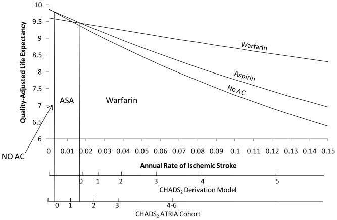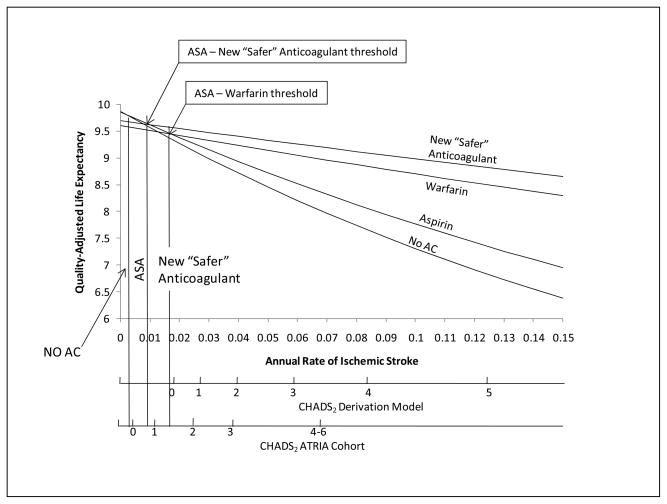 Conclusions: Use of a more contemporary estimate of stroke risk shifts the "tipping point," such that anticoagulation is preferred at a higher CHADS(2) score, reducing the number of patients for whom anticoagulation is recommended. The introduction of "new, safer" agents, however, would shift the tipping point in the opposite direction.