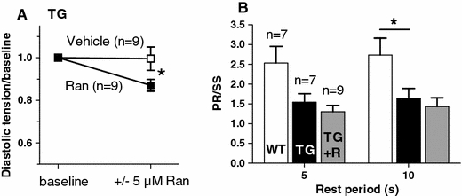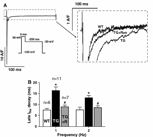 Transgenic (TG) Ca(2+)/calmodulin-dependent protein kinase II (CaMKII) δ(C) mice develop systolic heart failure (HF). CaMKII regulates intracellular Ca(2+) handling proteins as well as sarcolemmal Na(+) channels. We hypothesized that CaMKII also contributes to diastolic dysfunction and arrhythmias via augmentation of the late Na(+) current (late I(Na)) in early HF (8-week-old TG mice). Echocardiography revealed severe diastolic dysfunction in addition to decreased systolic ejection fraction. Premature arrhythmogenic contractions (PACs) in isolated isometrically twitching papillary muscles only occurred in TG preparations (5 vs. 0, P < 0.05) which could be completely terminated when treated with the late I(Na) inhibitor ranolazine (Ran, 5 μmol/L). Force-frequency relationships revealed significantly reduced twitch force amplitudes in TG papillary muscles. Most importantly, diastolic tension increased with raising frequencies to a greater extent in TG papillary muscles compared to WT specimen (at 10 Hz: 3.7 ± 0.4 vs. 2.5 ± 0.3 mN/mm²; P < 0.05). Addition of Ran improved diastolic dysfunction to 2.1 ± 0.2 mN/mm² (at 10 Hz; P < 0.05) without negative inotropic effects. Mechanistically, the late I(Na) was markedly elevated in myocytes isolated from TG mice and could be completely reversed by Ran. In conclusion, our results show for the first time that TG CaMKIIδ(C) overexpression induces diastolic dysfunction and arrhythmogenic triggers possibly via an enhanced late I(Na). Inhibition of elevated late I(Na) had beneficial effects on arrhythmias as well as diastolic function in papillary muscles from CaMKIIδ(C) TG mice. Thus, late I(Na) inhibition appears to be a promising option for diastolic dysfunction and arrhythmias in HF where CaMKII is found to be increased.