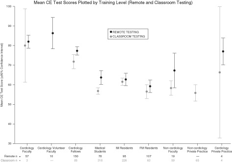 Conclusions: Academic and volunteer cardiologists outperformed other medical faculty, as did cardiology fellows. Lower scores were observed in more recently trained faculty. Remote testing yielded scores similar to proctored tests in comparable groups previously studied. No significant improvement was seen after medical school with residency training.