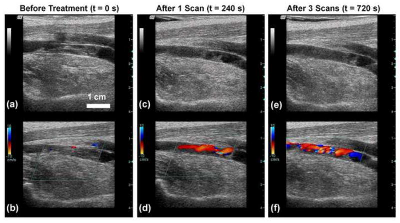 Methods and materials: Acute thrombi were formed in the femoral vein of juvenile pigs weighing 30-40 kg by balloon occlusion with two catheters and thrombin infusion. A 10-cm-diameter 1-MHz focused transducer was used for therapy. An 8-MHz ultrasound imager was used to align the clot with the therapy focus. Therapy consisted of five cycle pulses delivered at a rate of 1 kHz and peak negative pressure between 14 and 19 MPa. The focus was scanned along the long axis of the vessel to treat the entire visible clot during ultrasound exposure. The targeted region identified by a hyperechoic cavitation bubble cloud was visualized via ultrasound during treatment.
