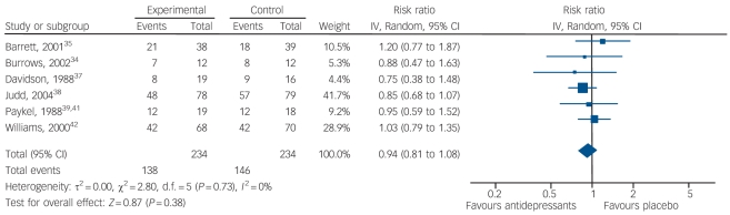 Results: Six studies met inclusion criteria. Three studies compared paroxetine with placebo; fluoxetine, amitriptyline and isocarboxazid were studied in one study each. No studies compared benzodiazepines with placebo. In terms of failures to respond to treatment (6 studies, 234 patients treated with antidepressants and 234 with placebo) no significant difference between antidepressants and placebo was found (relative risk (RR) 0.94, 95% CI 0.81-1.08). In terms of acceptability, data extracted from two studies (93 patients treated with antidepressants and 93 with placebo) showed no statistically significant difference between antidepressants and placebo (RR=1.06, 95% CI 0.65-1.73). There was no statistically significant between-study heterogeneity for any of the reported analyses.