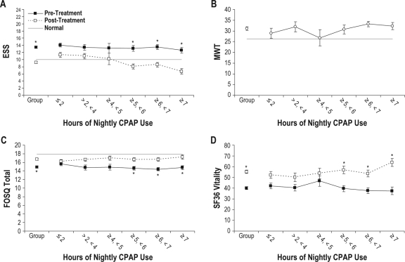 Measurements and results: Participants were assessed pretreatment and again after 3 months of CPAP therapy. At the beginning and at the conclusion of the trial, participants completed a day of testing that included measures of objective and subjective daytime sleepiness, neurocognitive function, and quality of life. In patients with symptomatic moderate to severe OSA (i.e., apnea-hypopnea index > 30/h), we found a treatment dose-response effect for CPAP in terms of Epworth Sleepiness Scale scores (P < 0.001). Several key indexes of neurobehavior (e.g., Functional Outcomes of Sleep Questionnaire, Epworth Sleepiness Scale) currently used to assess treatment response failed to normalize in a substantial group of patients after 3 months of CPAP treatment, even in those who were maximally compliant with treatment. Forty percent of patients in this trial had an abnormal Epworth Sleepiness Scale score at the conclusion of the trial. In addition, we showed no dose-response effect with the Maintenance of Wakefulness Test, raising doubts as to the clinical utility of the Maintenance of Wakefulness Test in assessing treatment response to CPAP in patients with OSA.