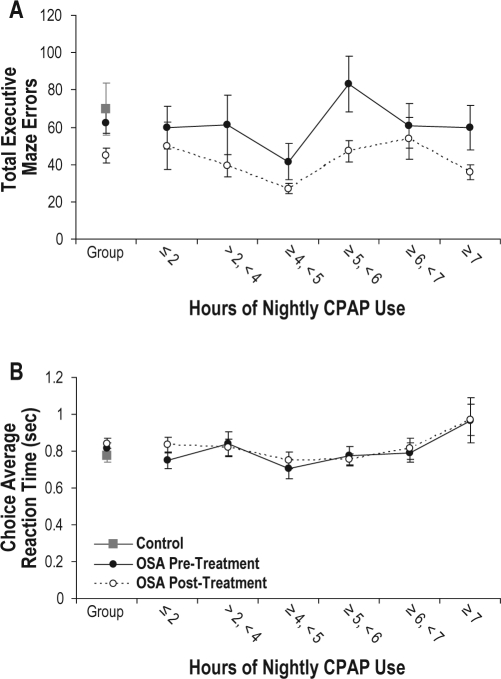 Conclusions: Our study suggests that a greater percentage of patients achieve normal functioning with longer nightly CPAP duration of use, but a substantial proportion of patients will not normalize neurobehavioral responses despite seemingly adequate CPAP use. It is thus crucial to adequately assess patients after CPAP therapy and seek alternate etiologies and treatments for any residual abnormalities.