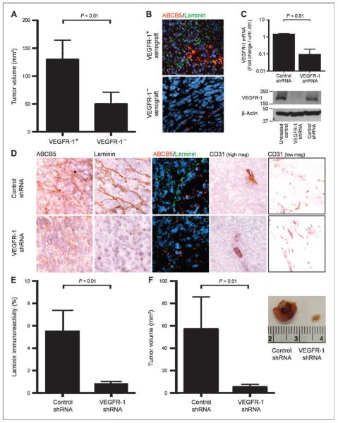 Melanoma growth is driven by malignant melanoma-initiating cells (MMIC) identified by expression of the ATP-binding cassette (ABC) member ABCB5. ABCB5(+) melanoma subpopulations have been shown to overexpress the vasculogenic differentiation markers CD144 (VE-cadherin) and TIE1 and are associated with CD31(-) vasculogenic mimicry (VM), an established biomarker associated with increased patient mortality. Here we identify a critical role for VEGFR-1 signaling in ABCB5(+) MMIC-dependent VM and tumor growth. Global gene expression analyses, validated by mRNA and protein determinations, revealed preferential expression of VEGFR-1 on ABCB5(+) tumor cells purified from clinical melanomas and established melanoma lines. In vitro, VEGF induced the expression of CD144 in ABCB5(+) subpopulations that constitutively expressed VEGFR-1 but not in ABCB5(-) bulk populations that were predominantly VEGFR-1(-). In vivo, melanoma-specific shRNA-mediated knockdown of VEGFR-1 blocked the development of ABCB5(+) VM morphology and inhibited ABCB5(+) VM-associated production of the secreted melanoma mitogen laminin. Moreover, melanoma-specific VEGFR-1 knockdown markedly inhibited tumor growth (by > 90%). Our results show that VEGFR-1 function in MMIC regulates VM and associated laminin production and show that this function represents one mechanism through which MMICs promote tumor growth.