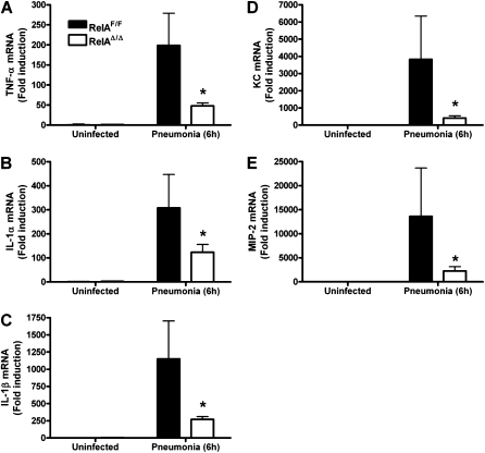 NF-κB regulates cytokine expression to initiate and control the innate immune response to lung infections. The NF-κB protein RelA is critical for pulmonary host defense during Streptococcus pneumoniae pneumonia, but the cell-specific roles of this transcription factor remain to be determined. We hypothesized that RelA in alveolar macrophages contributes to cytokine expression and host defense during pneumococcal pneumonia. To test this hypothesis, we compared mice lacking RelA exclusively in myeloid cells (RelA(Δ/Δ)) with littermate controls (RelA(F/F)). Alveolar macrophages from RelA(Δ/Δ) mice expressed no full-length RelA, demonstrating effective targeting. Alveolar macrophages from RelA(Δ/Δ) mice exhibited reduced, albeit detectable, proinflammatory cytokine responses to S. pneumoniae, compared with alveolar macrophages from RelA(F/F) mice. Concentrations of these cytokines in lung homogenates were diminished early after infection, indicating a significant contribution of macrophage RelA to the initial expression of cytokines in the lungs. However, the cytokine content in infected lungs was equivalent by 15 hours. Neutrophil recruitment during S. pneumoniae pneumonia reflected a delayed onset in RelA(Δ/Δ) mice, followed by similar rates of accumulation. Bacterial clearance was eventually effective in both genotypes, but began later in RelA(Δ/Δ) mice. Thus, during pneumococcal pneumonia, only the earliest induction of the cytokines measured depended on transcription by RelA in myeloid cells, and this transcriptional activity contributed to effective immunity.