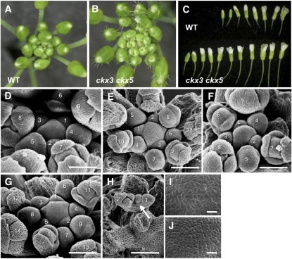 The size and activity of the shoot apical meristem is regulated by transcription factors and low molecular mass signals, including the plant hormone cytokinin. The cytokinin status of the meristem depends on different factors, including metabolic degradation of the hormone, which is catalyzed by cytokinin oxidase/dehydrogenase (CKX) enzymes. Here, we show that CKX3 and CKX5 regulate the activity of the reproductive meristems of Arabidopsis thaliana. CKX3 is expressed in the central WUSCHEL (WUS) domain, while CKX5 shows a broader meristematic expression. ckx3 ckx5 double mutants form larger inflorescence and floral meristems. An increased size of the WUS domain and enhanced primordia formation indicate a dual function for cytokinin in defining the stem cell niche and delaying cellular differentiation. Consistent with this, mutation of a negative regulator gene of cytokinin signaling, ARABIDOPSIS HISTIDINE PHOSPHOTRANSFER PROTEIN 6, which is expressed at the meristem flanks, caused a further delay of differentiation. Terminal cellular differentiation was also retarded in ckx3 ckx5 flowers, which formed more cells and became larger, corroborating the role of cytokinin in regulating flower organ size. Furthermore, higher activity of the ckx3 ckx5 placenta tissue established supernumerary ovules leading to an increased seed set per silique. Together, the results underpin the important role of cytokinin in reproductive development. The increased cytokinin content caused an ~55% increase in seed yield, highlighting the relevance of sink strength as a yield factor.