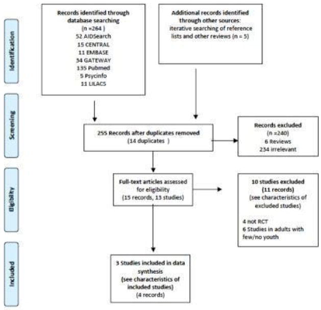 Search strategy: We searched electronic databases (CENTRAL, MEDLINE, EMBASE, AIDSearch, Gateway, PsycInfo, LILACS), reference lists of eligible articles, international health agency publication lists, and clinical trial registries. The search was updated January 2010. We contacted authors of published reports and other key role players.