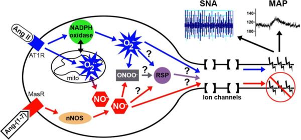 Reactive oxygen species (ROS) are important intra-neuronal signaling intermediates in angiotensin II (AngII)-related neuro-cardiovascular diseases associated with excessive sympathoexcitation, including hypertension and heart failure. ROS-sensitive effector mechanisms, such as modulation of ion channel activity, indicate that elevated levels of ROS increase neuronal activity. Nitric oxide, which may work to counter the effects of ROS, particularly superoxide, has been identified as a signaling molecule in angiotensin-1-7 (Ang-(1-7)) stimulated neurons. This review focuses on recent studies that have revealed details on the AngII-activated sources of ROS, the downstream redox-sensitive effectors, Ang-(1-7)-stimulated increase in nitric oxide, and the neuro-cardiovascular (patho)physiological responses modulated by these reactive species. Understanding these intra-neuronal signaling mechanisms should provide insight for the development of new redox-based therapeutics for the improved treatment of angiotensin-dependent neuro-cardiovascular diseases.