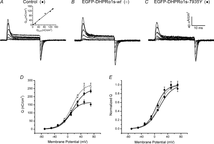 We investigated the effects of the overexpression of two enhanced green fluorescent protein (EGFP)-tagged α1sDHPR variants on Ca2+ currents (ICa), charge movements (Q) and SR Ca2+ release of muscle fibres isolated from adult mice. Flexor digitorum brevis (FDB)muscles were transfected by in vivo electroporation with plasmids encoding for EGFP-α1sDHPR-wt and EGFP-α1sDHPR-T935Y (an isradipine-insensitive mutant). Two-photon laser scanning microscopy (TPLSM) was used to study the subcellular localization of transgenic proteins, while ICa, Q and Ca2+ release were studied electrophysiologically and optically under voltage-clamp conditions. TPLSM images demonstrated that most of the transgenic α1sDHPR was correctly targeted to the transverse tubular system (TTS). Immunoblotting analysis of crude extracts of transfected fibres demonstrated the synthesis of bona fide transgenic EGFP-α1sDHPR-wt in quantities comparable to that of native α1sDHPR. Though expression of both transgenic variants of the alpha subunit of the dihydropyridine receptor (α1sDHPR) resulted in ∼50% increase in Q, they surprisingly had no effect on the maximal Ca2+ conductance (gCa) nor the SR Ca2+ release. Nonetheless, fibres expressing EGFP-α1sDHPR-T935Y exhibited up to 70% isradipine-insensitive ICa (ICa-ins) with a right-shifted voltage dependence compared to that in control fibres. Interestingly, Qand SRCa2+ release also displayed right-shifted voltage dependence in fibres expressing EGFP-α1sDHPR-T935Y. In contrast, the midpoints of the voltage dependence of gCa, Q and Ca2+ release were not different from those in control fibres and in fibres expressing EGFP-α1sDHPR-wt. Overall, our results suggest that transgenic α1sDHPRs are correctly trafficked and inserted in the TTS membrane, and that a substantial fraction of the mworks as conductive Ca2+ channels capable of physiologically controlling the release of Ca2+ from the SR. A plausible corollary of this work is that the expression of transgenic variants of the α1sDHPR leads to the replacement of native channels interacting with the ryanodine receptor 1 (RyR1), thus demonstrating the feasibility of molecular remodelling of the triads in adult skeletal muscle fibres.