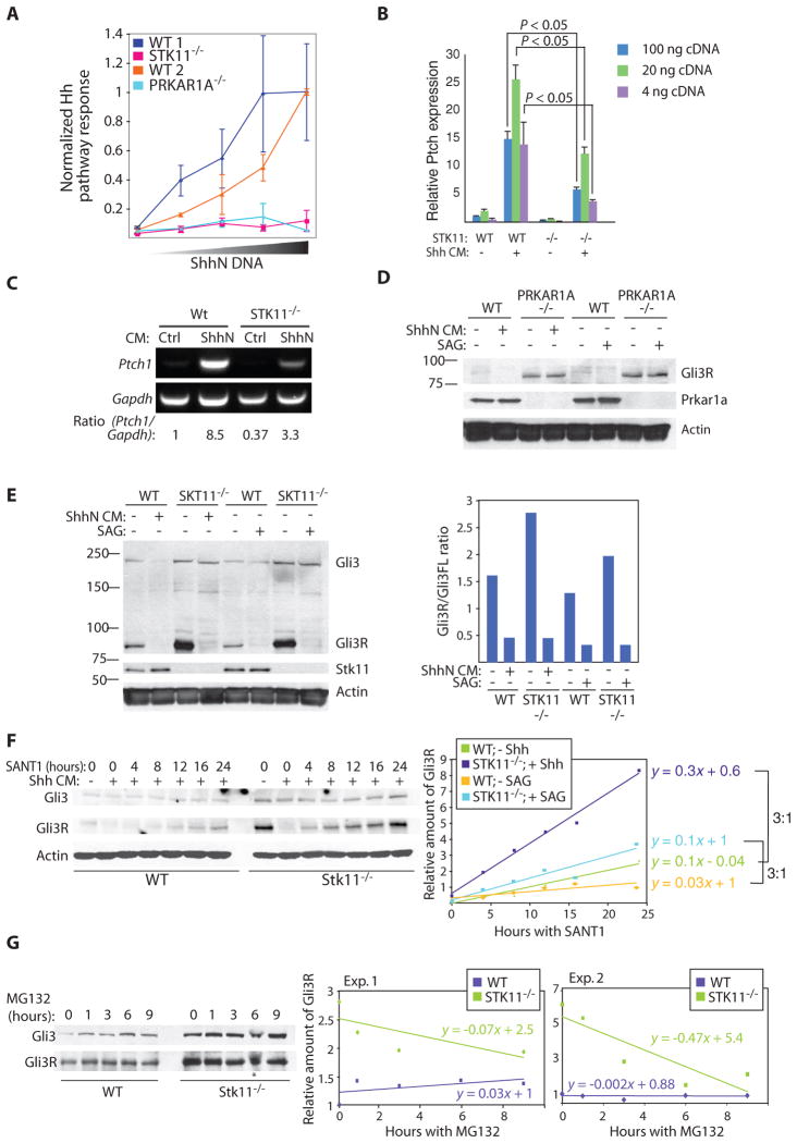 The Hedgehog (Hh) and Wnt signal transduction pathways are master regulators of embryogenesis and tissue renewal and represent anticancer therapeutic targets. Using genome-wide RNA interference screening in murine cultured cells, we established previously unknown associations between these signaling pathways and genes linked to developmental malformations, diseases of premature tissue degeneration, and cancer. We identified functions in both pathways for the multitasking kinase Stk11 (also known as Lkb1), a tumor suppressor implicated in lung and cervical cancers. We found that Stk11 loss resulted in disassembly of the primary cilium, a cellular organizing center for Hh pathway components, thus dampening Hh signaling. Loss of Stk11 also induced aberrant signaling through the Wnt pathway. Chemicals that targeted the Wnt acyltransferase Porcupine or that restored primary cilia length by inhibiting the tubulin deacetylase HDAC6 (histone deacetylase 6) countered deviant pathway activities driven by Stk11 loss. Our study demonstrates that Stk11 is a critical mediator in both the Hh and the Wnt pathways, and our approach provides a platform to support the development of targeted therapeutic strategies.