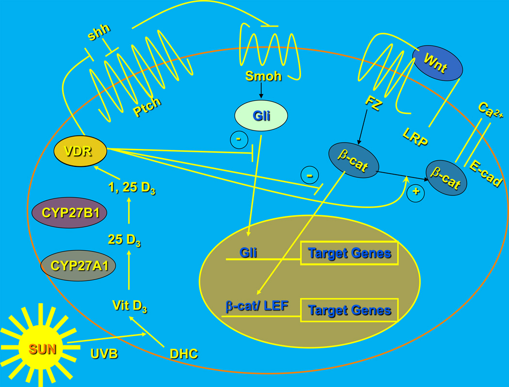 Epidemiologic evidence supporting a major chemopreventive role for vitamin D in various malignancies is strong. Likewise the use of the active metabolite of vitamin D, 1,25(OH)(2)D(3), and its analogs to prevent and/or treat a wide variety of malignancies in animals is well established. The evidence has been less compelling for epidermal carcinogenesis perhaps because the same agent that produces vitamin D in the skin, UVB radiation (UVR), is also the same agent that results in most epidermal malignancies. However, recent studies indicate that the role of vitamin D and its receptor (VDR) in protecting against the development of epidermal tumors deserves a closer look. One such study found mice lacking the VDR were quite sensitive to epidermal tumor formation following the administration of the carcinogen DMBA. A more recent study showed that these mice were similarly more sensitive to tumor formation following UVR, results we have confirmed. The epidermis of the VDR null mouse is hyperproliferative with gross distortion of hair follicles, structures that may provide the origin for the tumors found in the skin following such treatment. Two interacting pathways critical for epidermal and hair follicle function, beta-catenin and hedgehog (Hh), result in epidermal tumors when they are activated abnormally. Thus, we considered the possibility that loss of VDR predisposes to epidermal tumor formation by activation of either or both beta-catenin and Hh signaling. We determined that all elements of the Hh signaling pathway are upregulated in the epidermis and utricles of the VDR null mouse, and that 1,25(OH)(2)D(3) suppresses the expression of these elements in normal mouse skin. In addition we observed that the transcriptional activity of beta-catenin was increased in keratinocytes lacking the VDR. These results lead us to the hypothesis that the VDR with its ligand 1,25(OH)(2)D(3) functions as a tumor suppressor with respect to epidermal tumor formation in response to UVR by regulating Hh and beta-catenin signaling.