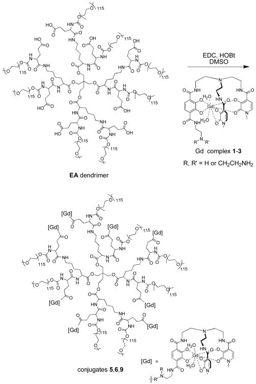 One essential requirement for more sensitive gadolinium-based MRI contrast agents is to slow the molecular tumbling of the gadolinium(III) ion, which increases the gadolinium's relaxivity (i.e., its ability to speed up the NMR relaxation of nearby water molecules). One route to this is through conjugation to high-molecular-weight polymers such as dendrimers. In this work, amine-functionalized TREN-bis(1,2-HOPO)-TAM-ethylamine and TREN-bis(1-Me-3,2-HOPO)-TAM-ethylamine ligands have been synthesized and attached to biocompatible 40 kDa esteramide (EA)- and poly-l-lysine (PLL)-based dendrimers capable of binding up to eight gadolinium complexes. These conjugates have T(1) relaxivities of up to 38.14 ± 0.02 mM(-1) s(-1) per gadolinium at 37 °C, corresponding to relaxivities of up to 228 mM(-1) s(-1) per dendrimer molecule. This relaxivity expressed on a "per Gd" basis is several times that of the small-molecule complexes and an order of magnitude higher than that of current commercial agents. Because of their high performance and low toxicity, these macromolecules may constitute an attractive complement to currently available gadolinium(III)-based contrast agents.