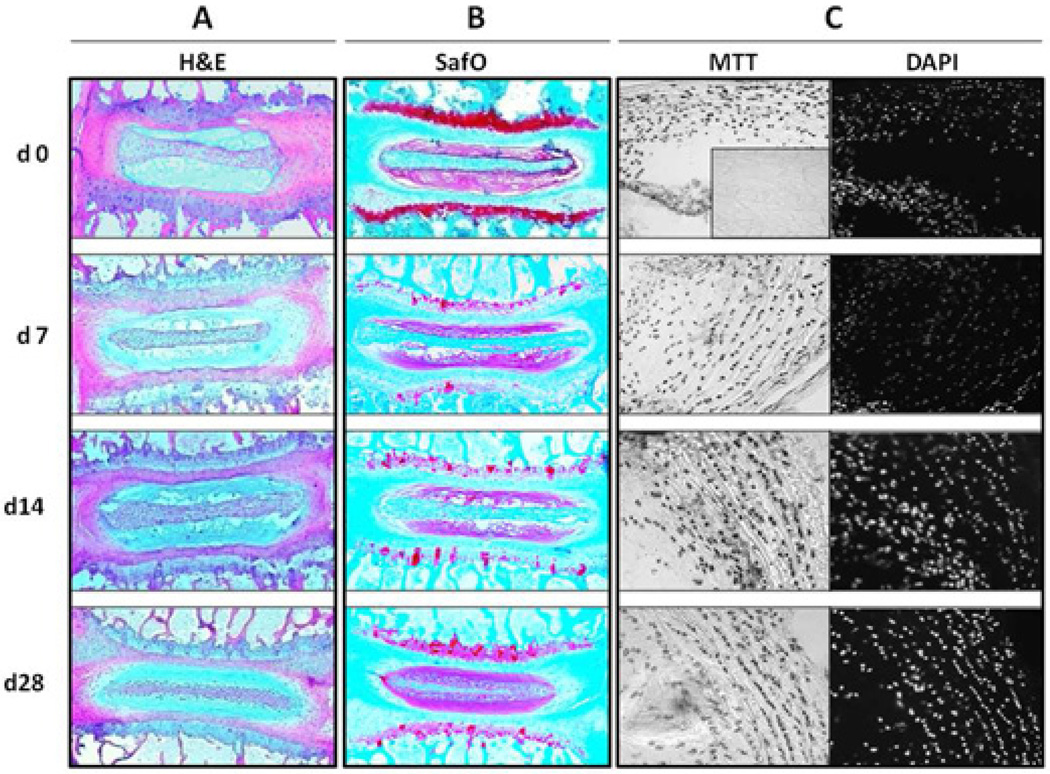 Conclusions: Mouse discs can be successfully maintained ex vivo for upward of 4 weeks with little cell death, change in histologic structure, or matrix protein synthesis. This organotypic model system closely mimics the in vivo environment of the disc. Exposure of these cultures to bupivacaine dramatically decreased cell viability and matrix protein synthesis in a dose- and time-dependent manner. These findings corroborate those previously reported by Lee et al. using disc cell culture and demonstrate that this anesthetic at clinically relevant doses is toxic to intervertebral discs in both cell culture and disc organ models representative of the native architectural context.