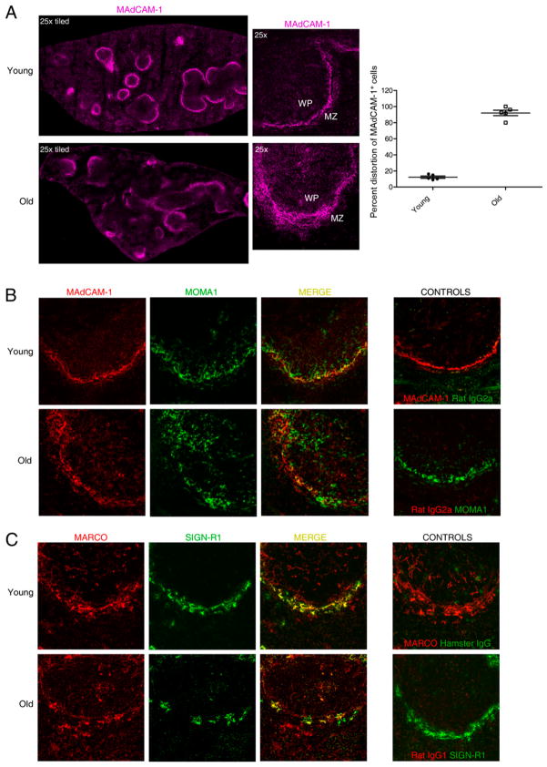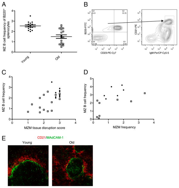 Marginal zones (MZs) are architecturally organized for clearance of and rapid response against blood-borne Ags entering the spleen. MZ macrophages (MZMs) and MZ B cells are particularly important in host defense against T-independent pathogens and may be crucial for the prevention of diseases, such as streptococcal pneumonia, that are devastating in older patients. Our objective was to determine whether there are changes in the cellular components of the MZ between old and young mice. Using immunocytochemistry and a blinded scoring system, we observed gross architectural changes in the MZs of old mice, including reduction in the abundance of MZMs surrounding the MZ sinus as well as disruptions in positioning of mucosal addressin cell adhesion molecule 1 (MAdCAM-1)(+) sinus lining cells and metallophilic macrophages. Loss of frequency of MZMs was corroborated by flow cytometry. A majority of old mice also showed reduced frequency of MZ B cells, which correlated with decreased abundance of MZM in individual old mice. The spleens of old mice showed less deposition of intravenously injected dextran particles within the MZ, likely because of the decreased frequency in MZMs, because SIGN-R1 expression was not reduced on MZM from old mice. The phagocytic ability of individual MZMs was examined using Staphylococcus aureus bioparticles, and no differences in phagocytosis were found between macrophages from young or old spleens. In summary, an anatomical breakdown of the MZ occurs in advanced age, and a reduction in frequency of MZM may affect the ability of the MZM compartment to clear blood-borne Ags and mount proper T-independent immune responses.