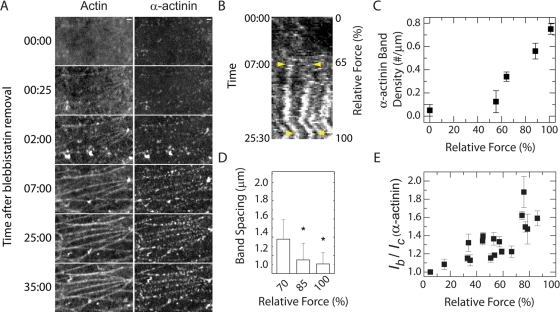 The regulation of cellular traction forces on the extracellular matrix is critical to cell adhesion, migration, proliferation, and differentiation. Diverse lamellar actin organizations ranging from contractile lamellar networks to stress fibers are observed in adherent cells. Although lamellar organization is thought to reflect the extent of cellular force generation, understanding of the physical behaviors of the lamellar actin cytoskeleton is lacking. To elucidate these properties, we visualized the actomyosin dynamics and organization in U2OS cells over a broad range of forces. At low forces, contractile lamellar networks predominate and force generation is strongly correlated to actomyosin retrograde flow dynamics with nominal change in organization. Lamellar networks build ∼60% of cellular tension over rapid time scales. At high forces, reorganization of the lamellar network into stress fibers results in moderate changes in cellular tension over slower time scales. As stress fibers build and tension increases, myosin band spacing decreases and α-actinin bands form. On soft matrices, force generation by lamellar networks is unaffected, whereas tension-dependent stress fiber assembly is abrogated. These data elucidate the dynamic and structural signatures of the actomyosin cytoskeleton at different levels of tension and set a foundation for quantitative models of cell and tissue mechanics.