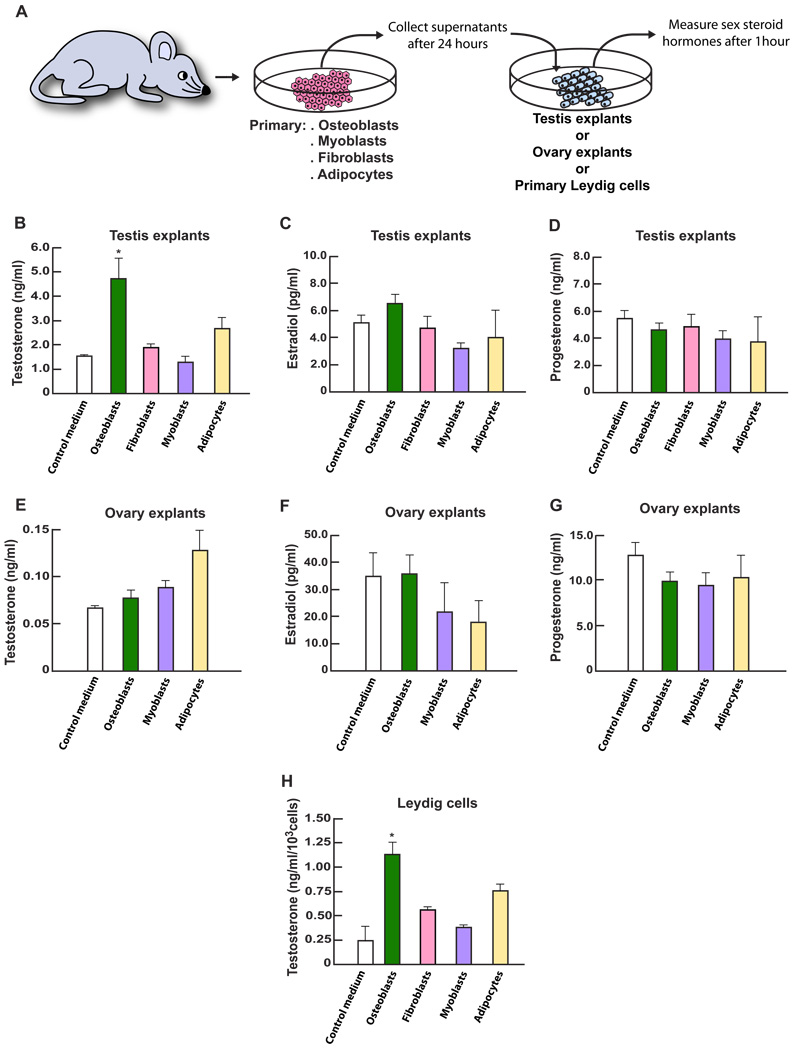 Interactions between bone and the reproductive system have until now been thought to be limited to the regulation of bone remodeling by the gonads. We now show that, in males, bone acts as a regulator of fertility. Using coculture assays, we demonstrate that osteoblasts are able to induce testosterone production by the testes, though they fail to influence estrogen production by the ovaries. Analyses of cell-specific loss- and gain-of-function models reveal that the osteoblast-derived hormone osteocalcin performs this endocrine function. By binding to a G protein-coupled receptor expressed in the Leydig cells of the testes, osteocalcin regulates in a CREB-dependent manner the expression of enzymes that is required for testosterone synthesis, promoting germ cell survival. This study expands the physiological repertoire of osteocalcin and provides the first evidence that the skeleton is an endocrine regulator of reproduction.