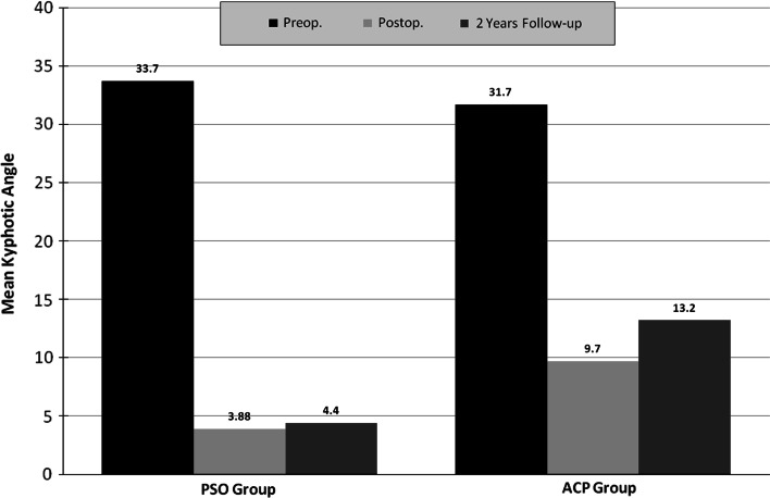 Kyphosis is a common sequel of inadequately managed thoracolumbar fractures. This study compares between pedicle subtraction osteotomy (PSO) and anterior corpectomy and plating (ACP) for correcting post-traumatic kyphosis. Forty-three patients with symptomatic post-traumatic kyphosis of the thoracolumbar spine were treated with PSO and prospectively followed for a minimum of 2 years. Visual Analogue Scale (VAS) and Oswestry Disability Index (ODI) were used to assess clinical improvement and radiographs were obtained at 2, 6, 12 and 24 months. The recorded clinical and radiological outcomes were compared to a control group of 37 patients, who were treated earlier by the same authors with ACP. The mean correction of the kyphotic angle was 29.8° for the PSO group and 22° for the ACP group (P = 0.001). PSO group showed significantly better improvement in the VAS score and the ODI. At final follow-up, patients reported very good satisfaction (93% in PSO vs. 81% in ACP) and good function (90% in PSO vs. 73% in ACP). Complications in the PSO group included pulling out of screws and recurrence of deformity requiring revision and longer fixation (1 patient), and transient lower limb paraesthesia (2 patients). Recorded complications in the ACP group included an aortic injury (1 patient) that was successfully repaired, pseudarthrosis (1 patient), persistent graft donor site morbidity (3 patients), and incisional hernia (1 patient). PSO and ACP are demanding procedures. PSO seems to be equally safe but more effective than ACP for correcting post-traumatic kyphosis.
