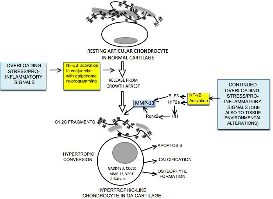 Human cartilage is a complex tissue of matrix proteins that vary in amount and orientation from superficial to deep layers and from loaded to unloaded zones. A major challenge to efforts to repair cartilage by stem cell-based and other tissue engineering strategies is the inability of the resident chondrocytes to lay down new matrix with the same structural and resilient properties that it had upon its original formation. This is particularly true of the collagen network, which is susceptible to cleavage once proteoglycans are depleted. Thus, a thorough understanding of the similarities and particularly the marked differences in mechanisms of cartilage remodeling during development, osteoarthritis, and aging may lead to more effective strategies for preventing cartilage damage and promoting repair. To identify and characterize effectors or regulators of cartilage remodeling in these processes, we are using culture models of primary human and mouse chondrocytes and cell lines and mouse genetic models to manipulate gene expression programs leading to matrix remodeling and subsequent chondrocyte hypertrophic differentiation, pivotal processes which both go astray in OA disease. Matrix metalloproteinases (MMP)-13, the major type II collagen-degrading collagenase, is regulated by stress-, inflammation-, and differentiation-induced signals that not only contribute to irreversible joint damage (progression) in OA, but importantly, also to the initiation/onset phase, wherein chondrocytes in articular cartilage leave their natural growth- and differentiation-arrested state. Our work points to common mediators of these processes in human OA cartilage and in early through late stages of OA in surgical and genetic mouse models.