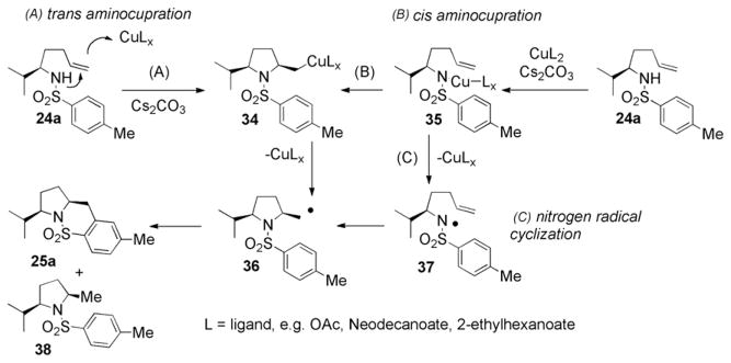 Copper(II) carboxylates and chiral copper(II) triflate·bis(oxazoline) complexes promote and catalyze intramolecular alkene carboamination, diamination and aminooxygenation reactions, creating an array of nitrogen heterocycles. High diastereoselectivity and enantioselectivity can be achieved in these transformations. This account reviews the discovery and development of these useful and interesting reactions.