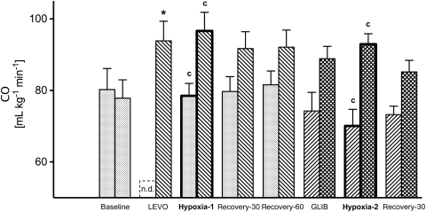 Results: In LEVO-pretreated hypoxemia, CO was significantly higher compared to unpretreated hypoxemia. The increased CO was neither associated with an increased VO₂ nor with markers of aggravated anaerobiosis (pH, BE, lactate). In addition, LEVO pretreatment did not further compromise gastromucosal μHbO₂ in hypoxemia. After combined LEVO + GLIB pretreatment, systemic effects of GLIB were apparent, however, CO was significantly higher than during unpretreated and GLIB-pretreated hypoxemia, but equal to LEVO-pretreated hypoxemia, indicating that GLIB did not prevent the increased CO in LEVO-pretreated hypoxia.