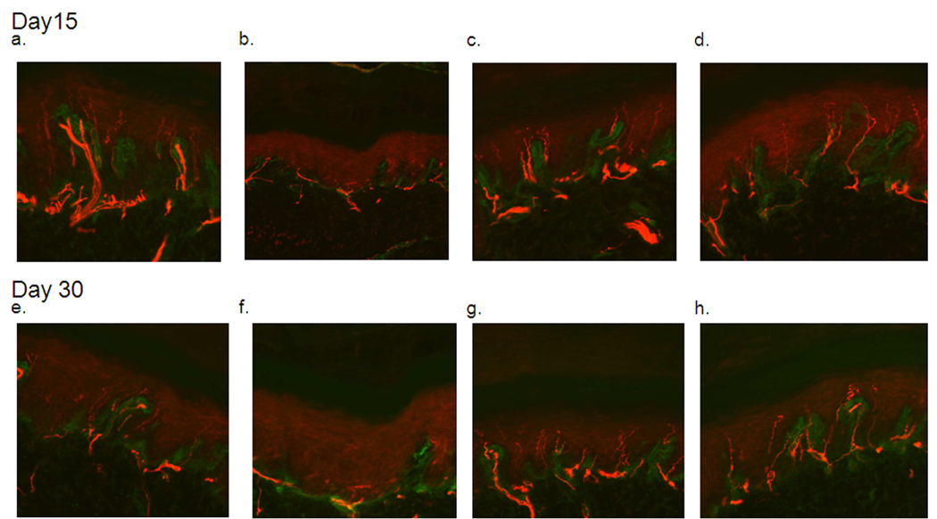 Treatment with the chemotherapeutic agent oxaliplatin produces a robust painful neuropathy similar to various other neuropathic conditions which result in loss of nerve fibers innervating the skin. This loss of intraepidermal nerve fibers (IENFs) appears to play an important role in neuropathy, but has yet to be investigated in oxaliplatin-induced neuropathic pain. For this study, mechanical hyperalgesia and IENF density were measured in rats receiving oxaliplatin, given at a dosage of 2 mg/kg every other day for four injections. The immunomodulatory agent minocycline (25 mg/kg) was also administered and was given 24 h prior to the first dose of oxaliplatin and continued throughout oxaliplatin treatment. Immunohistochemistry using the pan-neuronal marker PGP9.5 was used to investigate IENF densities in hind paw skin on Day 15 and Day 30. The results show that a robust mechanical sensitivity developed in oxaliplatin treated animals, as did a pronounced decrease in epidermal nerve fibers, and these outcomes were effectively prevented by minocycline treatment. This is the first study to show changes in IENF density in oxaliplatin treated animals, and confirm not only a relationship between IENF loss and hypersensitivity but also prevention of both with minocycline treatment.