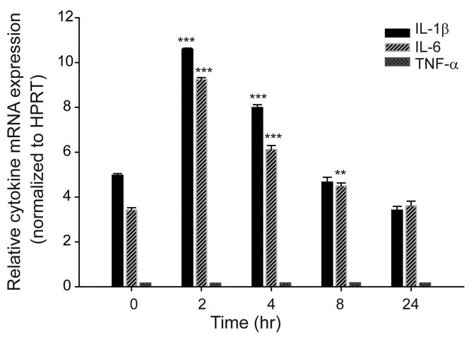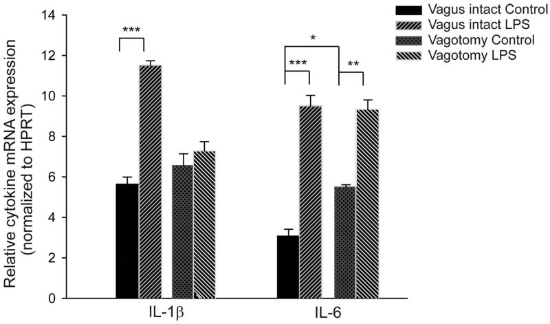 Perinatal sepsis and inflammation trigger lung and brain injury in preterm infants, and associated apnea of prematurity. We hypothesized that endotoxin exposure in the immature lung would upregulate proinflammatory cytokine mRNA expression in the medulla oblongata and be associated with impaired respiratory control. Lipopolysaccharide (LPS, 0.1mg/kg) or saline was administered intratracheally to rat pups and medulla oblongatas were harvested for quantifying expression of mRNA for proinflammatory cytokines. LPS-exposure significantly increased medullary mRNA for IL-1β and IL-6, and vagotomy blunted this increase in IL-1β, but not IL-6. Whole-body flow plethysmography revealed that LPS-exposed pups had an attenuated ventilatory response to hypoxia both before and after carotid sinus nerve transection. Immunochemical expression of IL-1β within the nucleus of the solitary tract and area postrema was increased after LPS-exposure. In summary, intratracheal endotoxin-exposure in rat pups is associated with upregulation of proinflammatory cytokines in the medulla oblongata that is vagally mediated for IL-1β and associated with an impaired hypoxic ventilatory response.