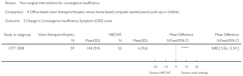 Interventions for convergence insufficiency: a network meta-analysis.Cochrane Database Syst Rev. 2020 Dec 2;12(12):CD006768. doi: 10.1002/14651858.CD006768.pub3. Cochrane Database Syst Rev. 2020. PMID: 33263359 Free PMC article.