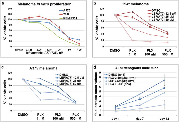 Melanoma is a tumour of transformed melanocytes, which are originally derived from the embryonic neural crest. It is unknown to what extent the programs that regulate neural crest development interact with mutations in the BRAF oncogene, which is the most commonly mutated gene in human melanoma. We have used zebrafish embryos to identify the initiating transcriptional events that occur on activation of human BRAF(V600E) (which encodes an amino acid substitution mutant of BRAF) in the neural crest lineage. Zebrafish embryos that are transgenic for mitfa:BRAF(V600E) and lack p53 (also known as tp53) have a gene signature that is enriched for markers of multipotent neural crest cells, and neural crest progenitors from these embryos fail to terminally differentiate. To determine whether these early transcriptional events are important for melanoma pathogenesis, we performed a chemical genetic screen to identify small-molecule suppressors of the neural crest lineage, which were then tested for their effects on melanoma. One class of compound, inhibitors of dihydroorotate dehydrogenase (DHODH), for example leflunomide, led to an almost complete abrogation of neural crest development in zebrafish and to a reduction in the self-renewal of mammalian neural crest stem cells. Leflunomide exerts these effects by inhibiting the transcriptional elongation of genes that are required for neural crest development and melanoma growth. When used alone or in combination with a specific inhibitor of the BRAF(V600E) oncogene, DHODH inhibition led to a marked decrease in melanoma growth both in vitro and in mouse xenograft studies. Taken together, these studies highlight developmental pathways in neural crest cells that have a direct bearing on melanoma formation.