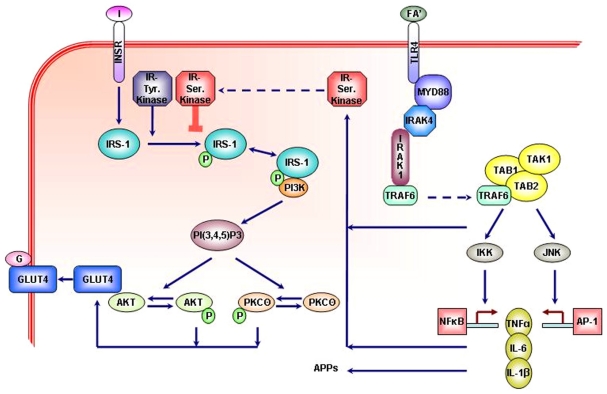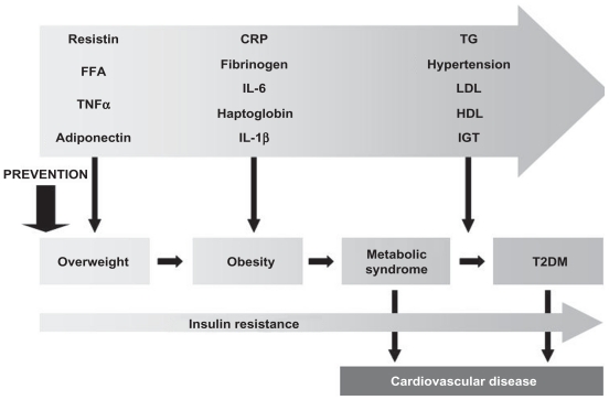 Obesity is a major risk factor for type 2 diabetes mellitus (T2DM), which is a significant health problem worldwide. Active disease is associated with low-grade chronic inflammation resulting in part from the activation of the innate immune system. In obesity, this activation leads to the release of pro-inflammatory cytokines such as tumor necrosis factor-α, interleukin-1β and interleukin-6 that block major anabolic cascades downstream of insulin signaling and thus disrupt insulin homeostasis and action. Cytokines also trigger the production of acute-phase reactants such as C-reactive protein, plasminogen activator inhibitor-1, serum amyloid-A, and haptoglobin. The elevated synthesis of pro-inflammatory cytokines and acute-phase proteins (inflammatory network) characterizes the early (or pre-clinical) stages of T2DM and exhibits a graded increase with the disease progression. Current evidence suggests that understanding inflammatory networks can point to new biomarkers that may permit capturing the interaction between genetic and environmental risk factors in the pathogenesis of T2DM. Such biomarkers have a significant public health potential in the prediction of disease occurrence beyond risk factors presently monitored, such as family history, lifestyle assessment and standard clinical chemistry profiles. Furthermore, inflammatory markers may assist in the evaluation of novel strategies for prevention, particularly in relation to micronutrients. This review discusses the current knowledge linking T2DM risk to inflammatory signaling pathways interacting with the innate immunity system and the prospect of inflammatory markers serving as molecular targets for prevention and/or biomarkers for early risk prediction of T2DM. The potential of micronutrients replenishment to improve insulin action by attenuating inflammation is also evaluated in the context of the public health relevance of this approach.