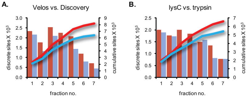 Protein phosphorylation is among the most common and intensely studied post-translational protein modification. It plays crucial roles in virtually all cellular processes and has been implicated in numerous human diseases, including cancer. Traditional biochemical and genetic methods for identifying and monitoring sites of phosphorylation are laborious and slow and in recent years have largely been replaced by mass spectrometric analysis. Improved methods for phosphopeptide enrichment coupled with faster and more sensitive mass spectrometers have led to an explosion in the size of phosphoproteomic datasets. However, wider application of these methods is limited by equipment costs and the resultant high demand for instrument time as well as by a technology gap between biologists and mass spectrometrists. Here we describe a modified two-step enrichment strategy that employs lysC digestion and step elution from self-packed strong cation exchange (SCX) solid phase extraction (SPE) columns followed by immobilized metal ion affinity chromatography (IMAC) and LC-MS/MS analysis using a hybrid LTQ Orbitrap Velos mass spectrometer. The SCX procedure does not require an HPLC system, demands little expertise, and because multiple samples can be processed in parallel, can provide a large savings of time and labor. We demonstrate this method in conjunction with stable isotope labeling to quantitate peptides harboring >8000 unique phosphorylation sites in yeast in 12h of instrument analysis time and examine the impact of enzyme choice and instrument platform.