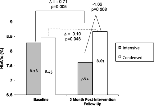 Results: Adoption of both programs was high (>85% attendance rates, 95% retention). At 3 months post-intervention, the between-group difference in A1C change was -0.72% (p = 0.02), in favor of the intensive program. A1C reduction was partially mediated by problem-solving skill at follow-up (ß = -0.13, p = 0.04). Intensive program patients demonstrated within-group improvements in knowledge (p < 0.001), problem-solving (p = 0.01), and self-management behaviors (p = 0.04). Among the subsets of patients with suboptimal blood pressure or lipids at baseline, the intensive program yielded clinically significant individual improvements in SBP, DBP, and LDL cholesterol. Patient satisfaction and usability ratings were high for both programs.