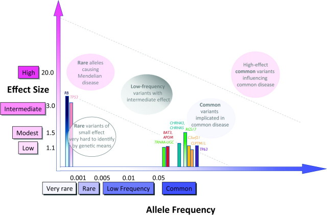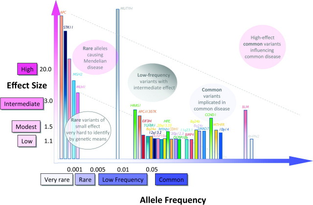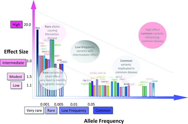 Genome-wide association studies have broadened our understanding of the genetic architecture of cancer to include common variants, in addition to the rare variants previously identified by linkage analysis. We review current knowledge on the genetic architecture of four cancers--breast, lung, prostate and colorectal--for which the balance of common and rare alleles identified ranges from fewer common alleles (lung cancer) to more common alleles (prostate cancer). Although most variants are cancer specific, pleiotropy has been observed for several variants, for example, variants at the 8q24 locus and breast, ovarian and prostate cancers or variants in KITLG in relation to hair color and testicular cancer. Although few studies have been adequately powered to investigate heterogeneity among ancestry groups, effect sizes associated with common variants have been reported to be fairly homogenous among ethnic groups. Some associations appear to be ancestry specific, such as HNF1B, which is associated with prostate cancer in European Americans and Latinos but not in African-Americans. Studies of cancer and other complex diseases suggest that a simple dichotomy between rare and common allelic architectures may be too simplistic and that future research is needed to characterize a fuller spectrum of allele frequency (common (>5%), uncommon (1-5%) and rare (<<1%) alleles) and effect size. In addition, a broadening of the concept of genetic architecture to encompass both population architecture, which reflects differences in exposures, genetic factors and population level risk among diverse groups of people, and genomic architecture, which includes structural, epigenomic and somatic variation, is envisioned.