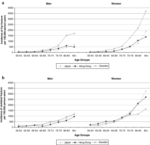 Results: The mean age at baseline was 62 ± 8.2 years for women and 68 ± 10.3 years for men. The average duration of follow-up was 4.0 ± 2.8 (range, 1 to 14) years for a total of 14,733 person-years for the whole cohort. The incidence rate for vertebral fracture was 194/100,000 person-years in men and 508/100,000 person-years in women, respectively. For subjects above the age of 65, the clinical vertebral fracture and hip fracture rates were 299/100,000 and 332/100,000 person-years, respectively, in men, and 594/100,000 and 379/100,000 person-years, respectively, in women. Hong Kong Chinese and Japanese populations have a less dramatic increase in hip fracture rates associated with age than Caucasians. At the age of 65 or above, the hip fracture rates for Asian (Hong Kong Chinese and Japanese) men and women were less than half of that in Caucasians, but the vertebral fracture rate was higher in Asians, resulting in a high vertebral-to-hip fracture ratio.