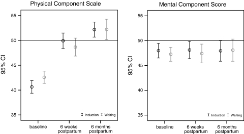 Results: We analyzed data of 361 randomized and 198 non-randomized patients. There were no clinically relevant differences between the treatments at 6 weeks or 6 months postpartum on any summary measures; e.g., on the SF-36 (PCS: P = .09; MCS: P = .48). The PCS and the MCS were below norm values at inclusion. The PCS improved over time but stayed below norm values at 6 months, while the MCS did not improve.
