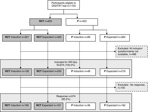 Methods: Both randomized and non-randomized women were asked to participate in the HR-QoL study. Women were asked to fill out written validated questionnaires, covering background characteristics, condition-specific issues and the Short Form (SF-36), European Quality of Life (EuroQoL 6D3L), Hospital Anxiety and Depression scale (HADS), and Symptom Check List (SCL-90) at baseline, 6 weeks postpartum and 6 months postpartum. We compared the difference scores of all summary measures between the two management strategies by ANOVA. A repeated measures multivariate mixed model was defined to assess the effect of the management strategies on the physical (PCS) and mental (MCS) components of the SF-36. Analysis was by intention to treat.