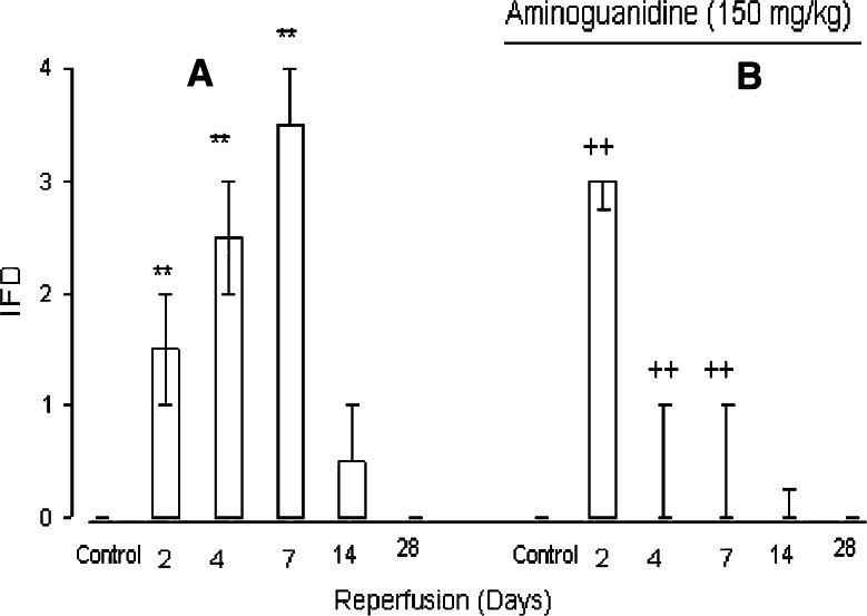 The present work was designed to investigate the potential protective effects of post-ischemic treatment with aminoguanidine (AG) on sciatic nerve ischemia/reperfusion (I/R) injury in rat. Seventy-two rats were divided into 12 groups (n = 6). We used ischemia model in these groups by occluding the right common iliac and femoral arteries for 3 h with a silk suture 6-0 using slipknot technique. Treatment groups (2, 4, 6, 8, 10, and 12) received 150 mg/kg AG intraperitoneally 24 h after induction of ischemia. After certain time intervals of reperfusion (2, 4, 7, 14, and 28 days), the function of the hind limb was assessed using behavioral scores based on gait, racing reflex, toe spread, pinch sensitivity, paw position, and grasp. After euthanasia, sciatic nerves were removed at the end of reperfusion times and sections were cut at 5 μm, then were stained for light microscopy studies and graded for ischemic fiber degeneration (IFD), edema, and apoptosis. Maximal behavioral deficit occurred at 7 days of reperfusion. The comparison of behavioral score pertaining to the control and AG groups revealed significant differences and showed also a better time course in recovery (P < 0.05). Other than 3 and 4 groups, the amount of edema in AG treatment groups showed significant differences compared with control groups (P < 0.05). IFD was also significantly decreased in the AG treatment groups than controls. Most importantly, I/R-induced apoptosis were improved significantly on the 4th, 7(th), and 14th days of reperfusion in AG-treated groups compared to controls. In conclusion, our findings suggest that post-ischemic administration of AG exhibits protective effect against sciatic nerve I/R injury.