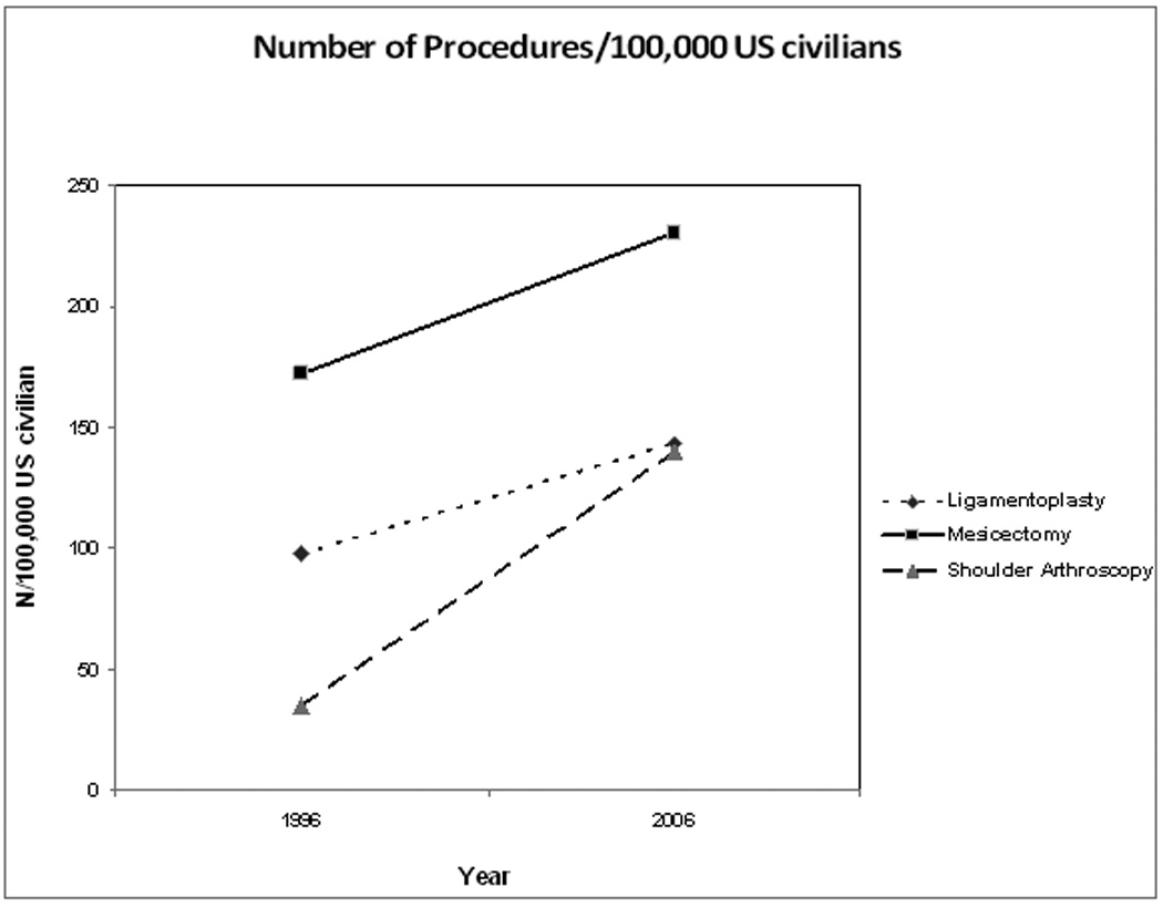 Methods: Data from the National Survey of Ambulatory Surgery for the years of 1996 and 2006 were analyzed. Entries indicating the performance of knee ligamentoplasty, meniscectomy, or shoulder arthroscopy were identified and included in the sample. Temporal changes in a number of variables associated with orthopedic ambulatory surgery were assessed, including (1) the number of procedures being performed, (2) patient and health care system-related demographics, and (3) anesthesia-related variables.