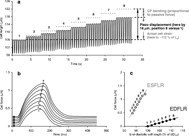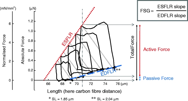 This paper briefly recapitulates the Frank-Starling law of the heart, reviews approaches to establishing diastolic and systolic force-length behaviour in intact isolated cardiomyocytes, and introduces a dimensionless index called 'Frank-Starling Gain', calculated as the ratio of slopes of end-systolic and end-diastolic force-length relations. The benefits and limitations of this index are illustrated on the example of regional differences in Guinea pig intact ventricular cardiomyocyte mechanics. Potential applicability of the Frank-Starling Gain for the comparison of cell contractility changes upon stretch will be discussed in the context of intra- and inter-individual variability of cardiomyocyte properties.