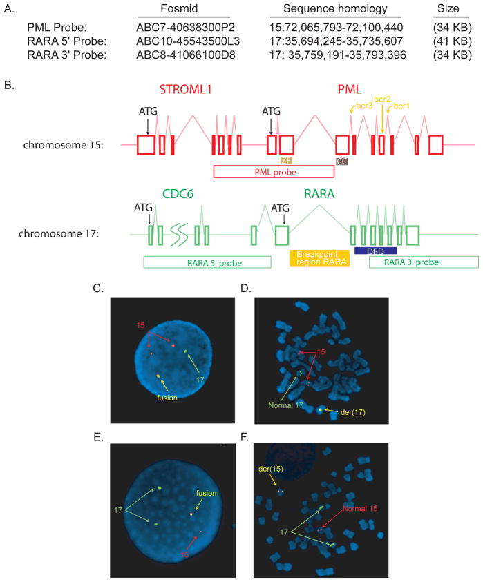 Results: Massively parallel paired-end sequencing allowed identification of a cytogenetically cryptic event: a 77-kilobase segment from chromosome 15 was inserted en bloc into the second intron of the RARA gene on chromosome 17, resulting in a classic bcr3 PML-RARA fusion gene. Reverse transcription polymerase chain reaction sequencing subsequently validated the expression of the fusion transcript. Novel FISH probes identified 2 additional cases of t(15;17)-negative acute promyelocytic leukemia that had cytogenetically invisible insertions. Whole-genome sequencing and validation were completed in 7 weeks and changed the treatment plan for the patient.