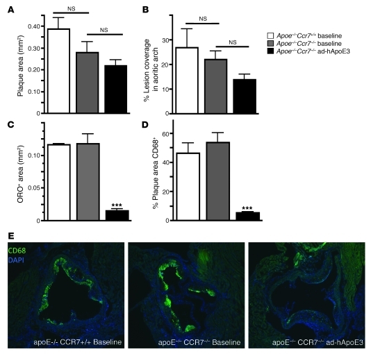 Experimental models of atherosclerosis suggest that recruitment of monocytes into plaques drives the progression of this chronic inflammatory condition. Cholesterol-lowering therapy leads to plaque stabilization or regression in human atherosclerosis, characterized by reduced macrophage content, but the mechanisms that underlie this reduction are incompletely understood. Mice lacking the gene Apoe (Apoe-/- mice) have high levels of cholesterol and spontaneously develop atherosclerotic lesions. Here, we treated Apoe-/- mice with apoE-encoding adenoviral vectors that induce plaque regression, and investigated whether macrophage removal from plaques during this regression resulted from quantitative alterations in the ability of monocytes to either enter or exit plaques. Within 2 days after apoE complementation, plasma cholesterol was normalized to wild-type levels, and HDL levels were increased 4-fold. Oil red O staining and quantitative mass spectroscopy revealed that esterified cholesterol content was markedly reduced. Plaque macrophage content decreased gradually and was 72% lower than baseline 4 weeks after apoE complementation. Importantly, this reduction in macrophages did not involve migratory egress from plaques or CCR7, a mediator of leukocyte emigration. Instead, marked suppression of monocyte recruitment coupled with a stable rate of apoptosis accounted for loss of plaque macrophages. These data suggest that therapies to inhibit monocyte recruitment to plaques may constitute a more viable strategy to reduce plaque macrophage burden than attempts to promote migratory egress.
